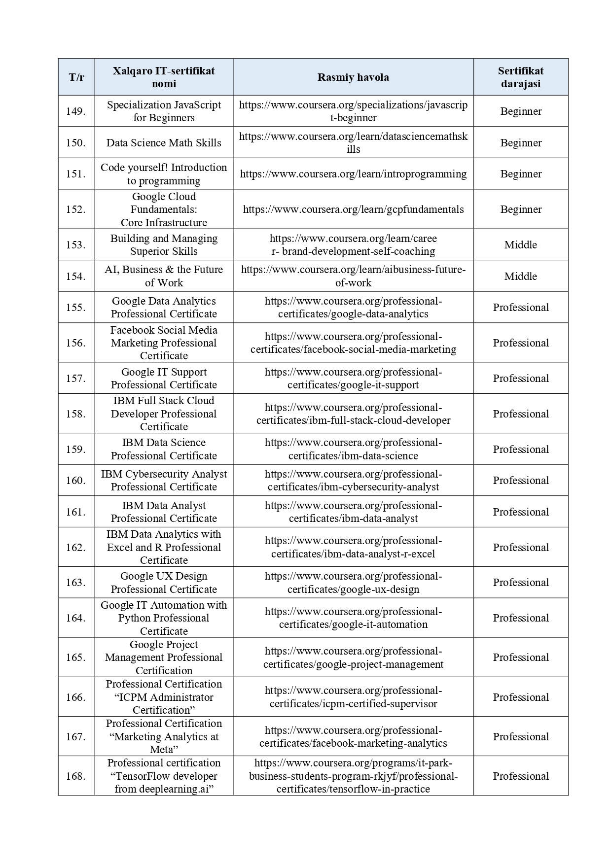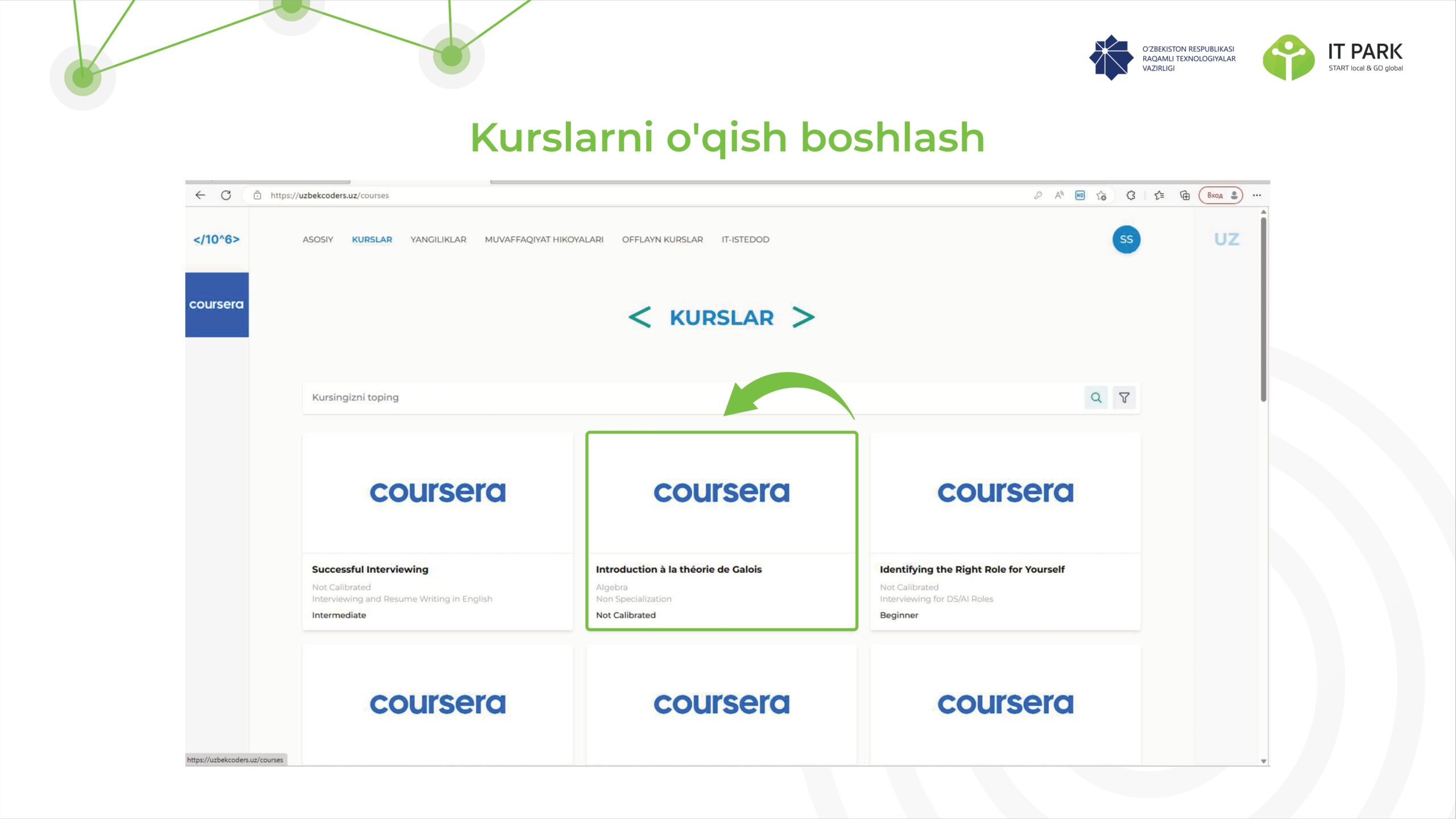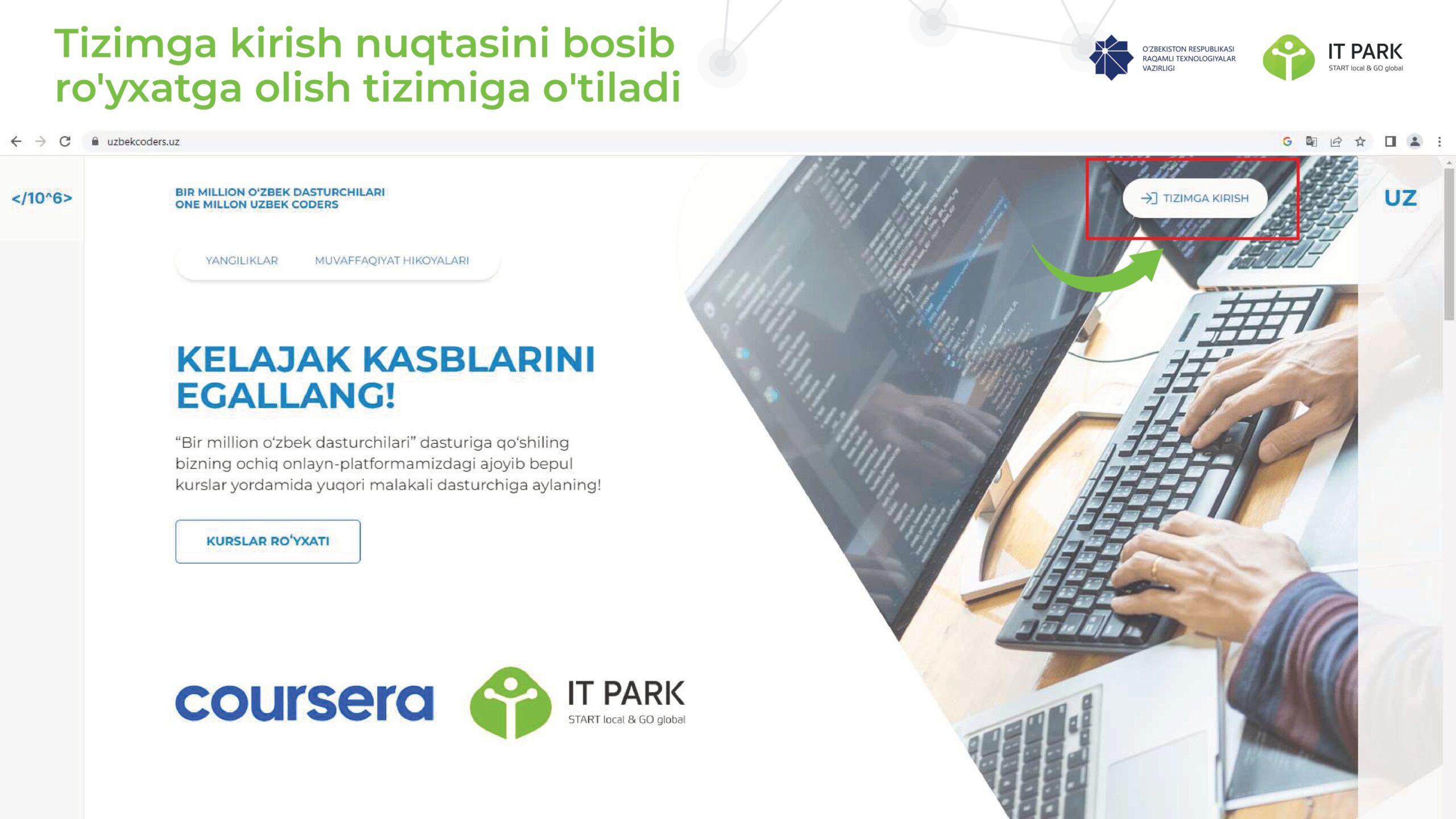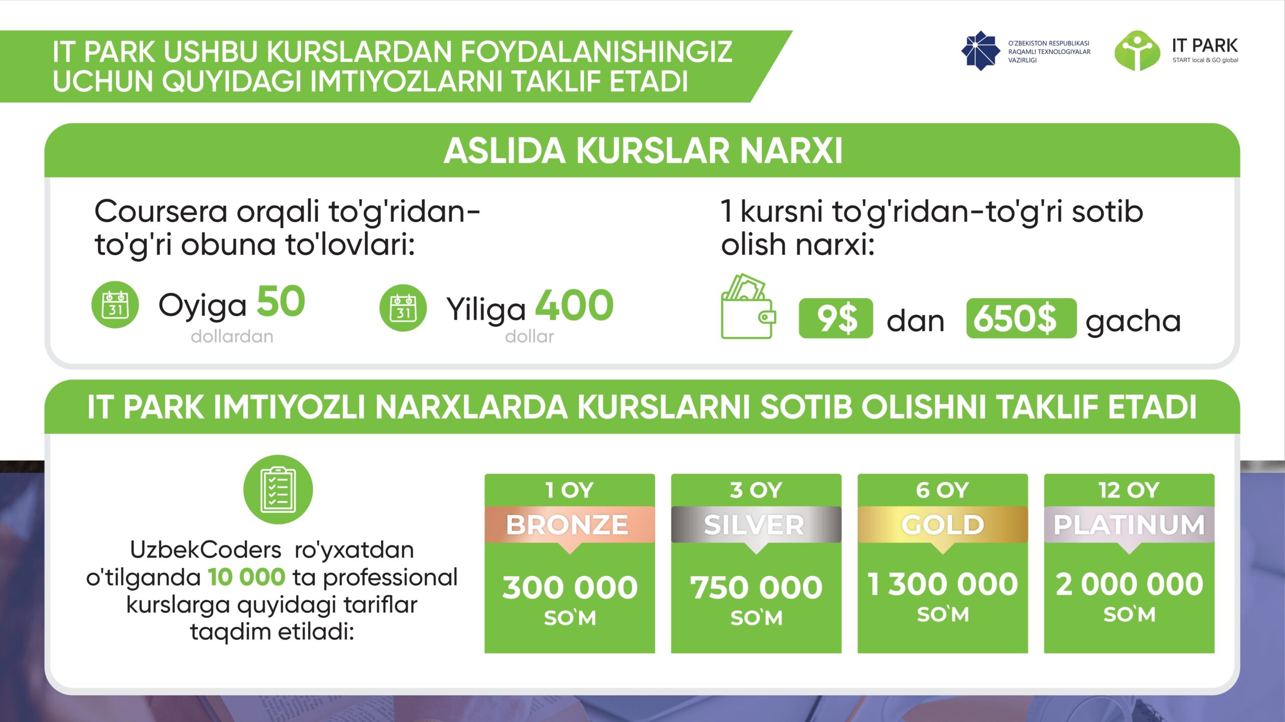O‘zbekiston Respublikasi Prezidentining 2023-yil 11-sentabrdagi PQ-300-son qarori ijrosini taʼminlash maqsadida Raqamli texnologiyalar vazirligi tomonidan IT-sohasiga qiziquvchi iqtidorli talaba yoshlarga “Bir million dasturchi” loyihasining https://uzbekcoders.uz platformasi orqali AQSHning “Cousera” kompaniyasining onlayn ta’lim resurlaridan foydalanish imkoniyati yaratilganligini maʼlum qilamiz.