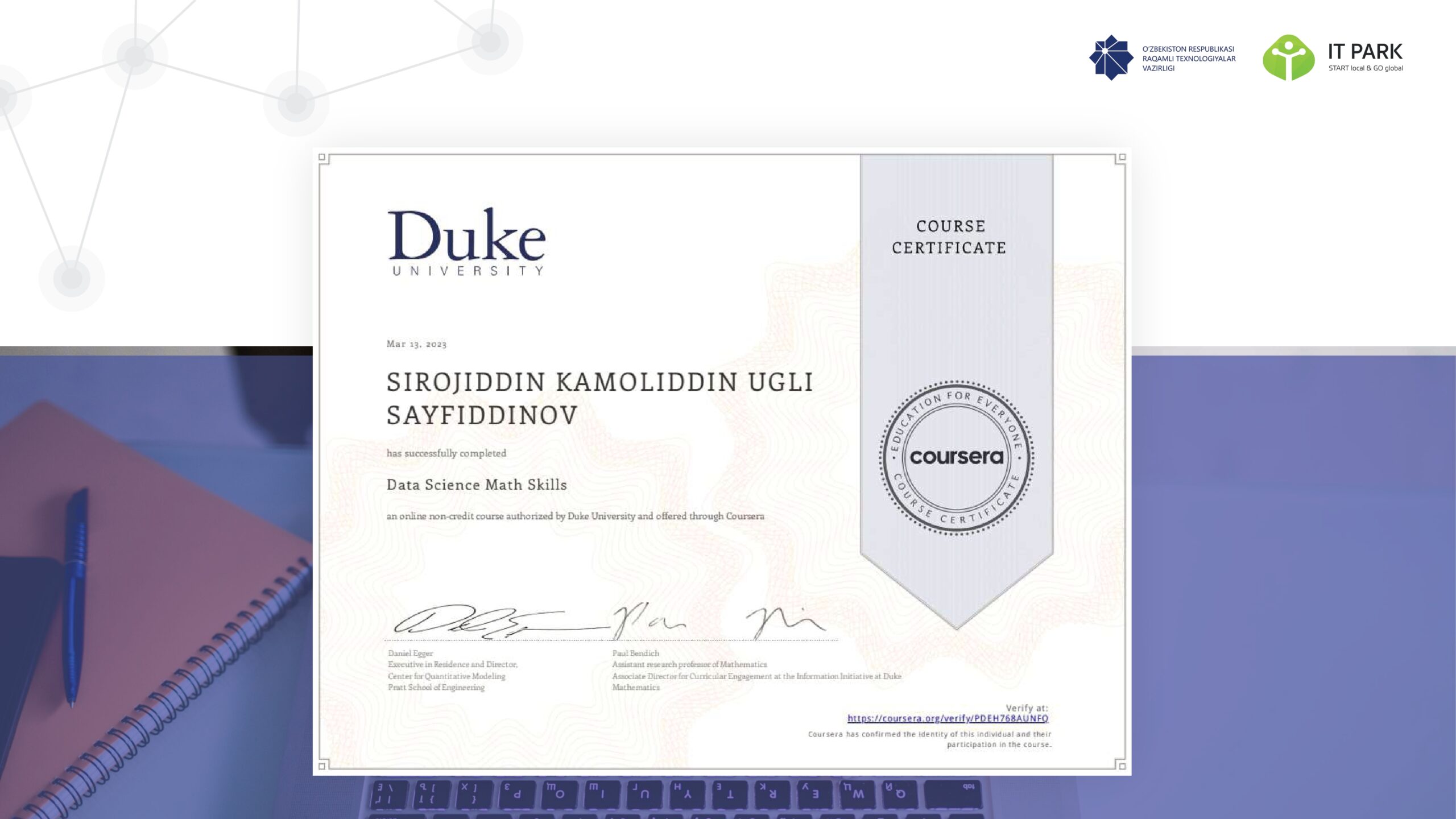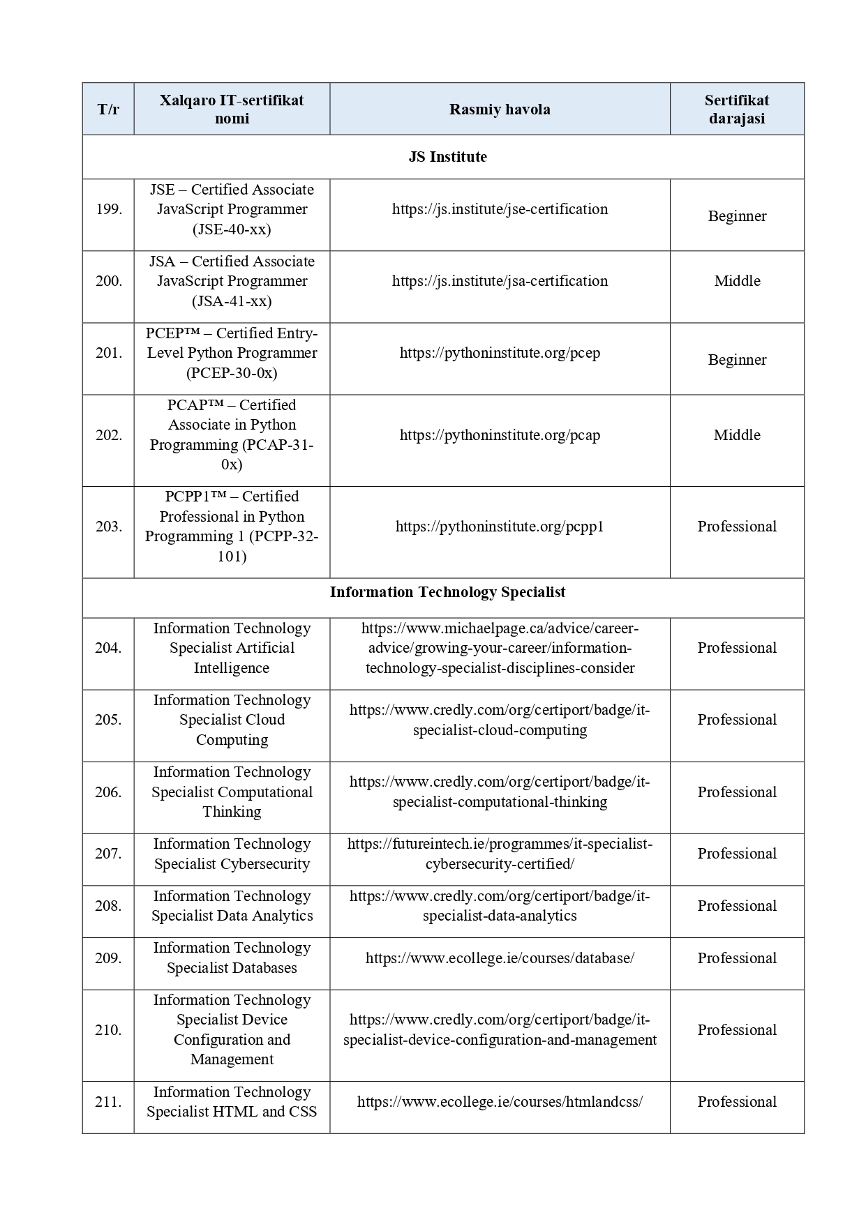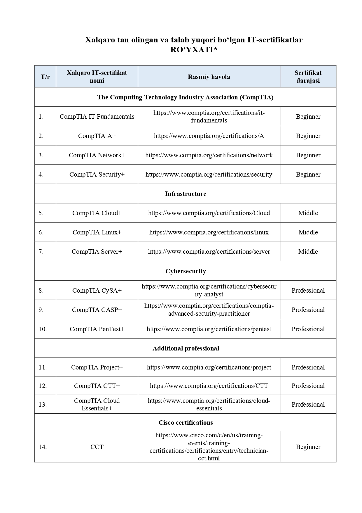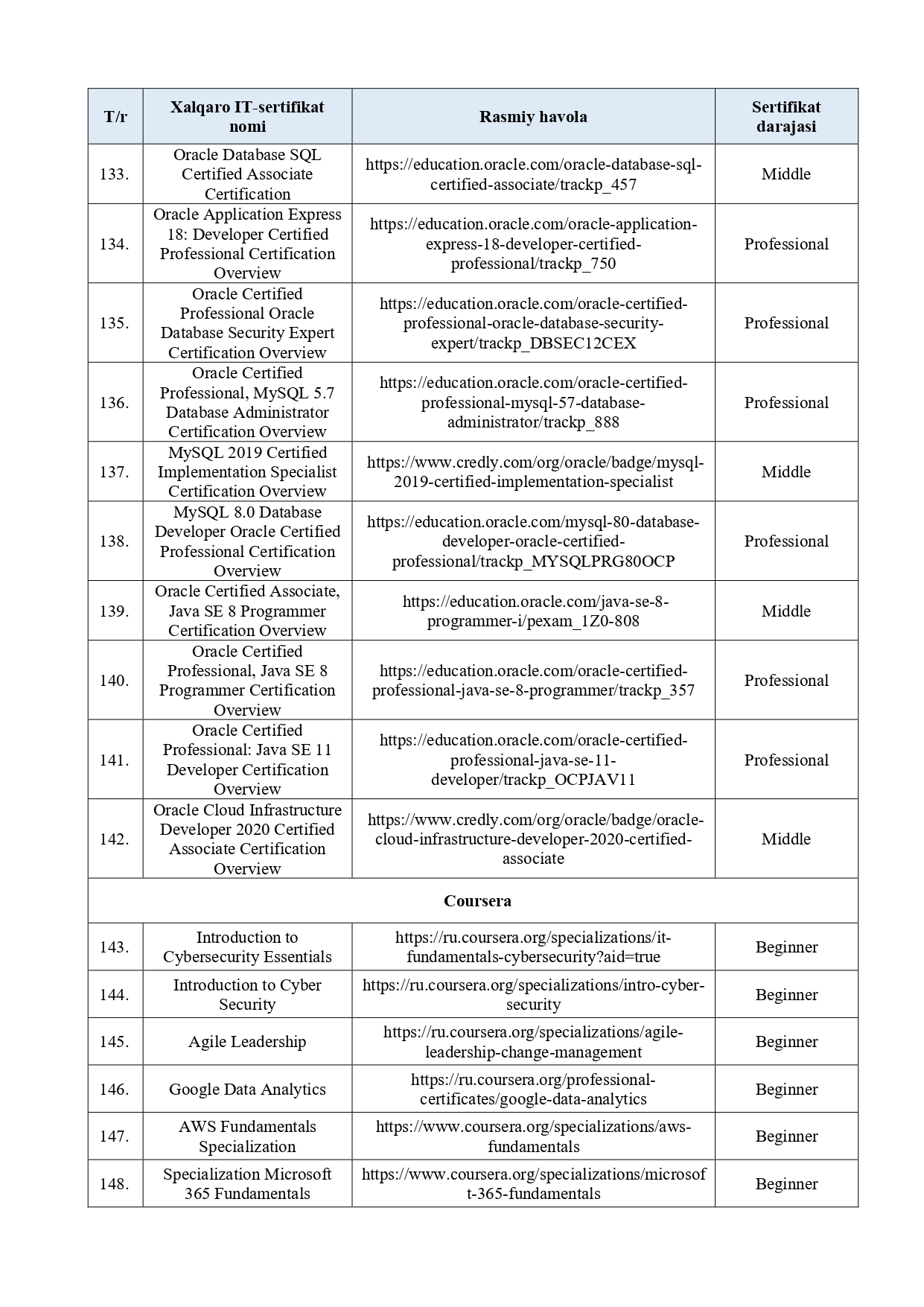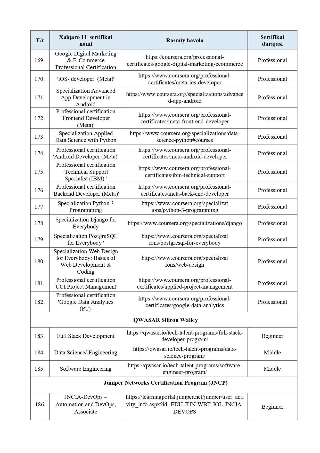 O‘zbekiston Respublikasi Prezidentining 2023-yil 11-sentabrdagi PQ-300-son qarori ijrosini taʼminlash maqsadida Raqamli texnologiyalar vazirligi tomonidan IT-sohasiga qiziquvchi iqtidorli talaba yoshlarga “Bir million dasturchi” loyihasining https://uzbekcoders.uz platformasi orqali AQSHning “Cousera” kompaniyasining onlayn ta’lim resurlaridan foydalanish imkoniyati yaratilganligini maʼlum qilamiz.