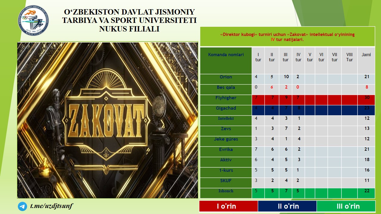 Yoshlarning bo’sh vaqtini mazmunli tashkil etish, ular orasidan ziyrak, bilimli, intiluvchan va qobiliyatli yoshlarni aniqlash maqsadida O’zbekiston davlat jismoniy tarbiya va sport universiteti Nukus filiali talabalari o’rtasida “Zakovat” intellektual o’yinining “Direktor kubogi” turniriga start berilgan edi.