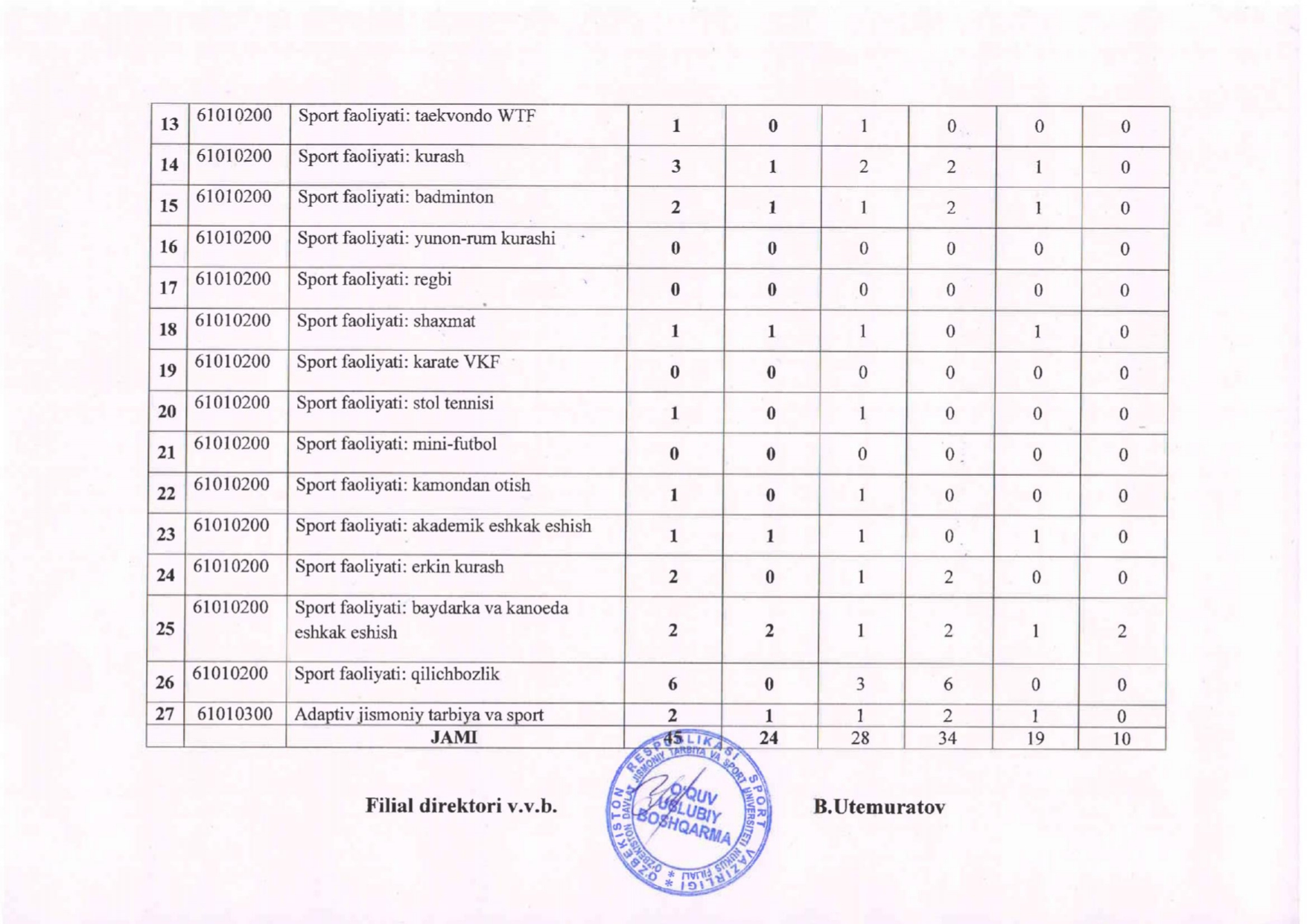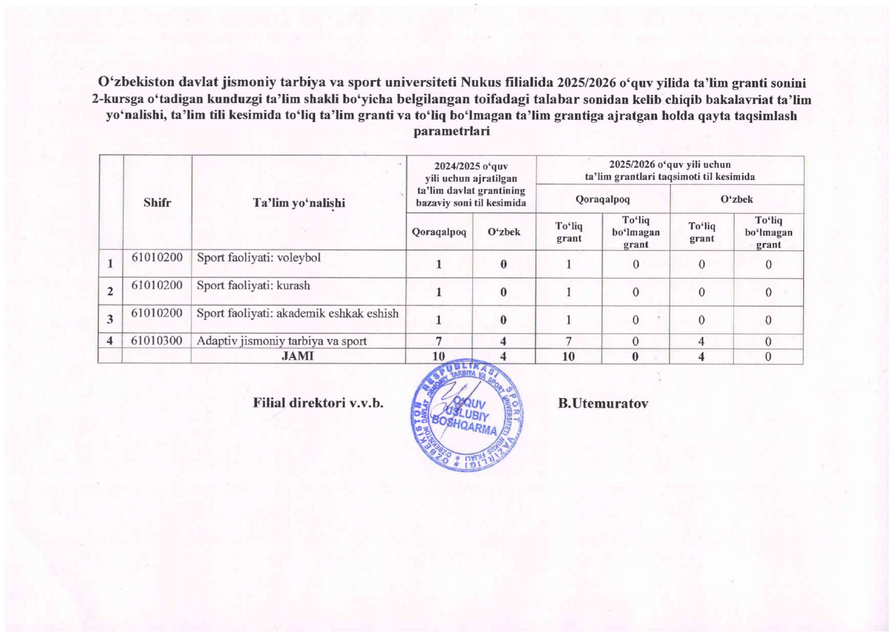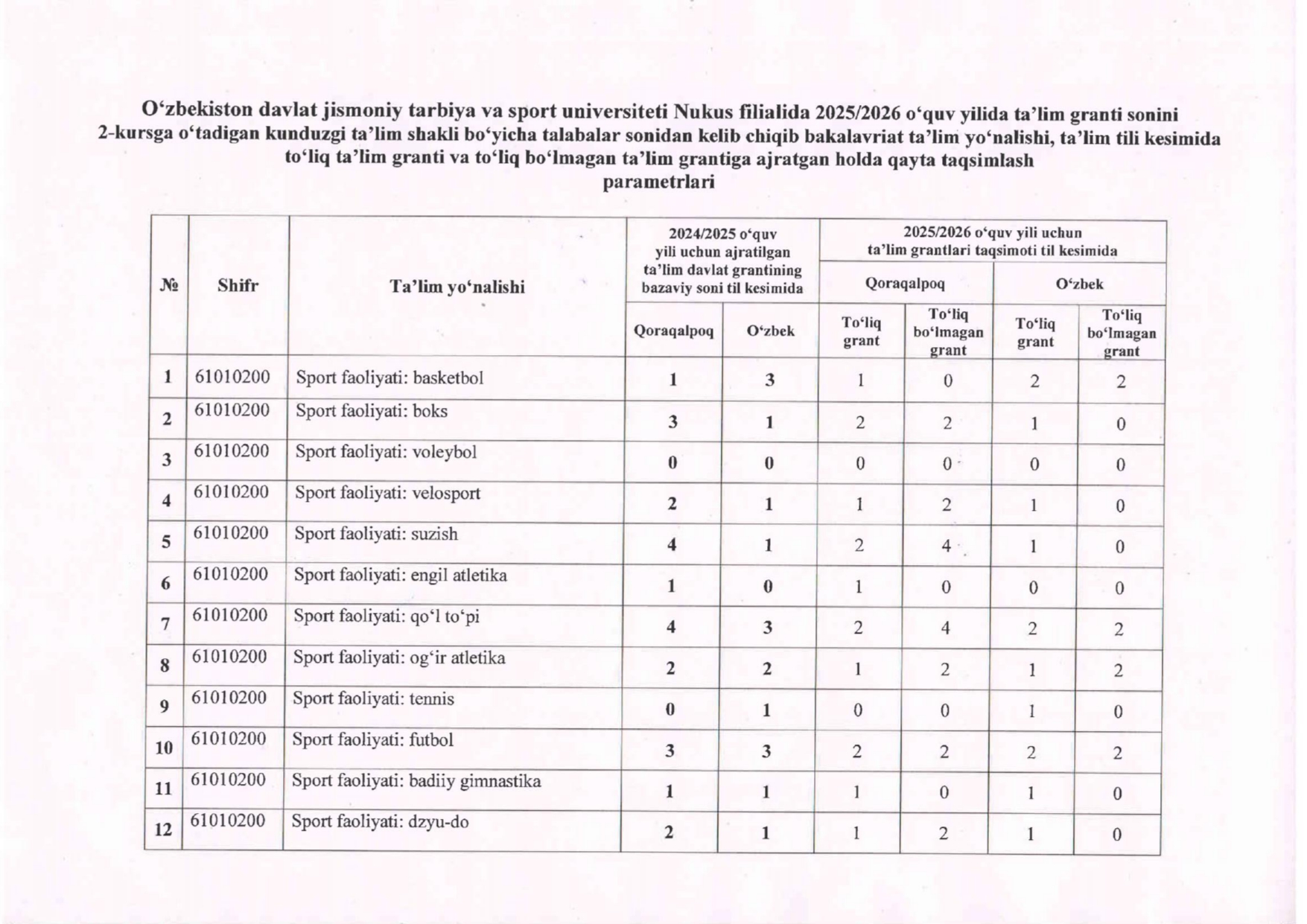 Ushbu qaror asosida O‘zbekiston davlat jismoniy tarbiya va sport universiteti Nukus filiali direktorining buyrug‘i chiqdi. Ushbu buyruq bilan 2025-2026-o‘quv yili uchun ta’lim granti soni 2-kursga o‘tadigan kunduzgi ta’lim shakli bo‘yicha talabalar sonidan kelib chiqib bakalavriat ta’lim yo‘nalishi, ta’lim tili kesimida to‘liq ta’lim granti va to‘liq bo‘lmagan ta’lim grantiga ajratilgan holda qayta taqsimlash parametrlari tasdiqlandi.
