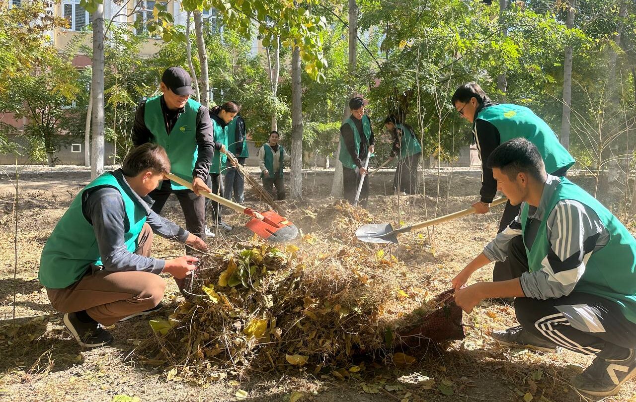Unda talabalar tyutori D.Urazxanov bilan birgalikda filial atrofini daraxtlardan tushgan barglardan tozalamoqda va barglar maxsus joylarga ko‘mib tashlanmoqda. Bu usul yerning organik o‘g‘it bilan boyishiga xizmat qiladi.