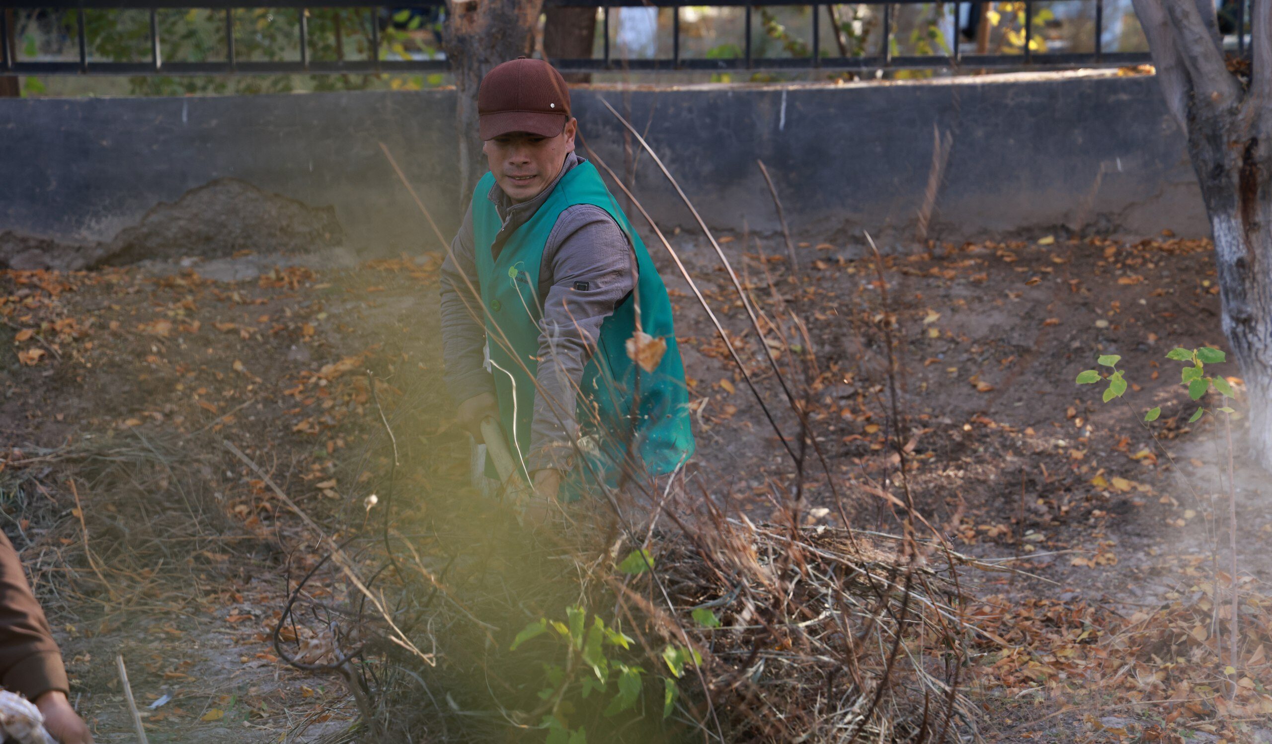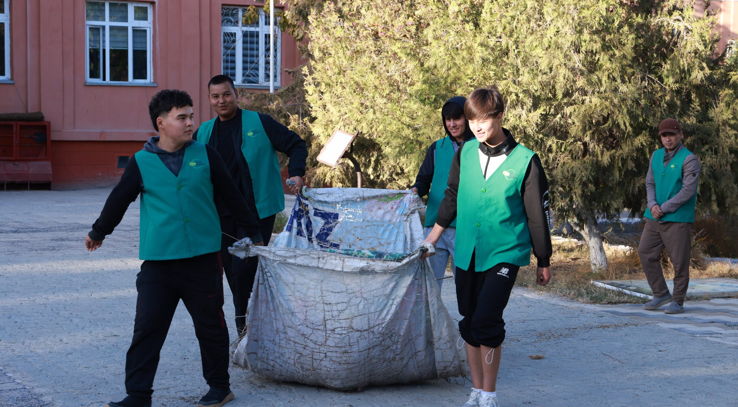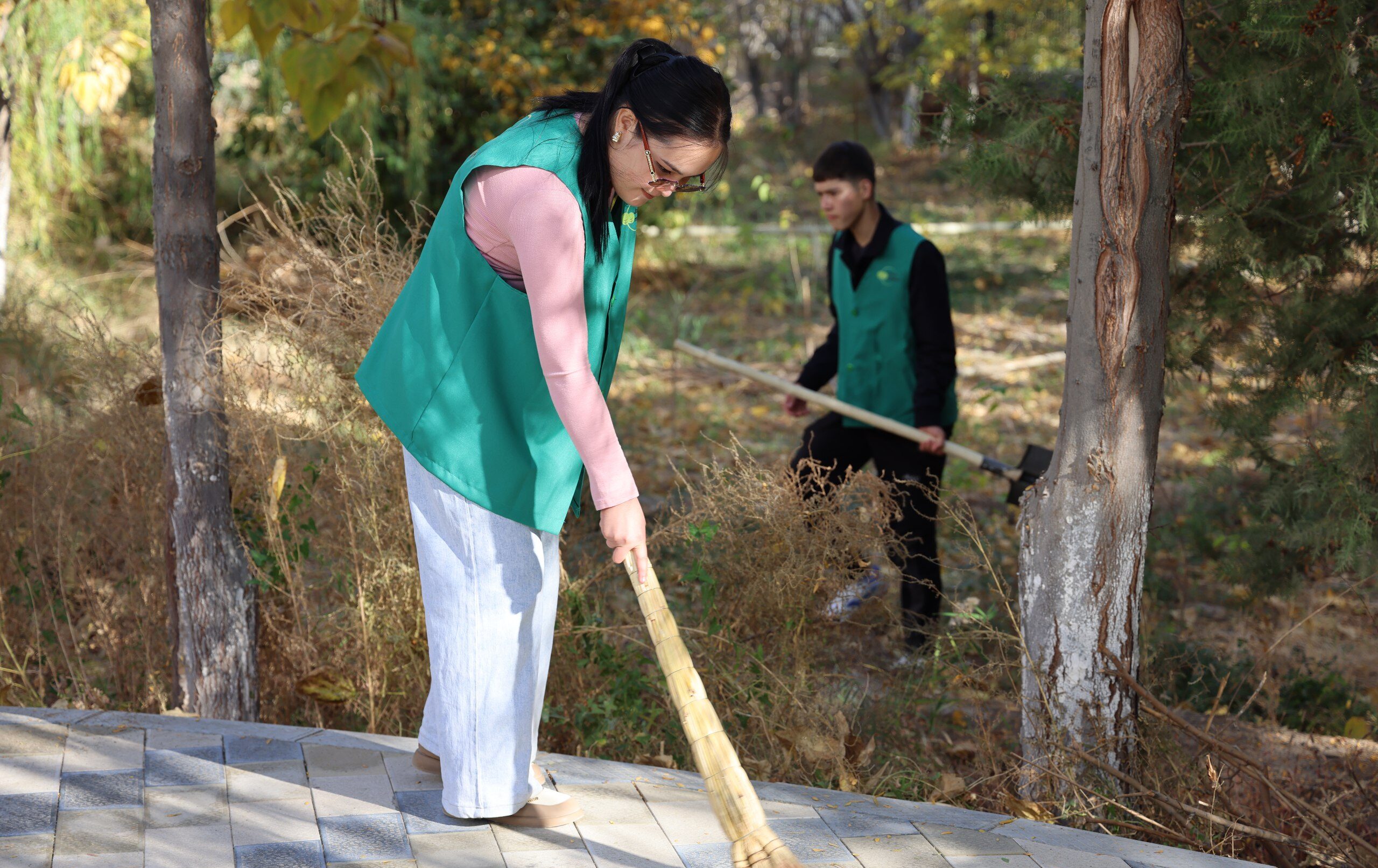 Bunda talabalar tyutorlari bilan birgalikda filial atrofini qurigan yovvoyi o‘tlardan va daraxt barglaridan tozalamoqda.