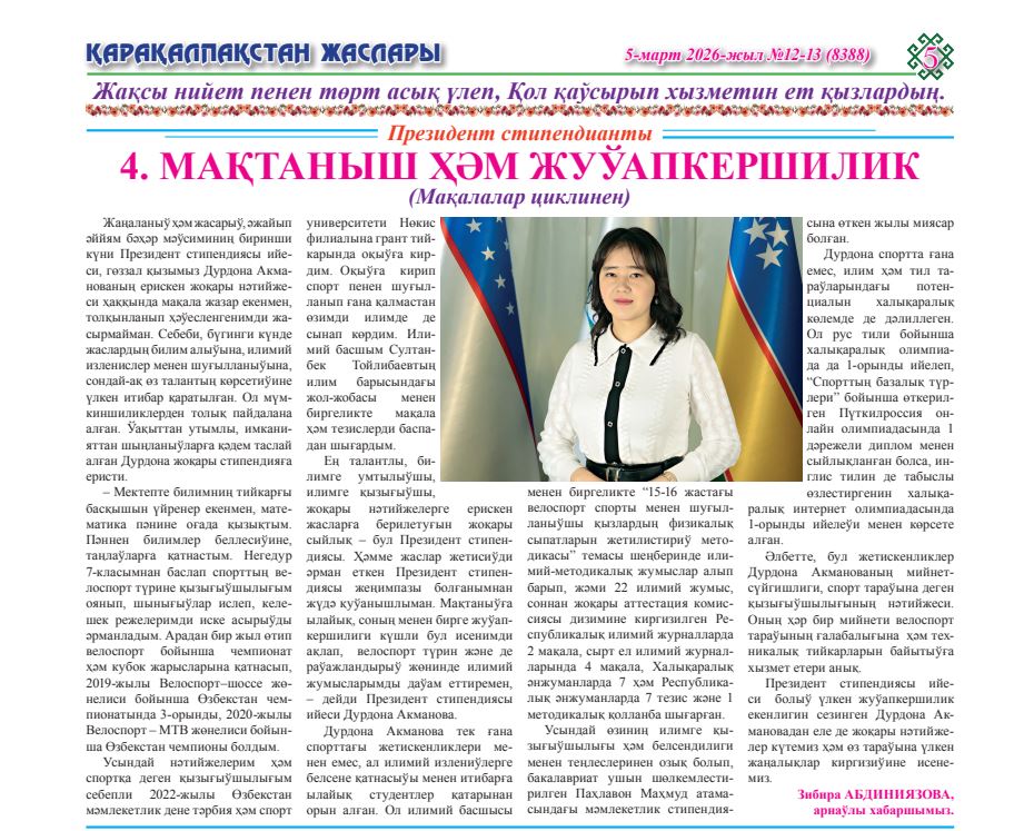 Bu haqida «Qaraqalpaqstan Jasları» gazetasining 2026-yil 5-mart kungi 12-13-sonida chop etildi.