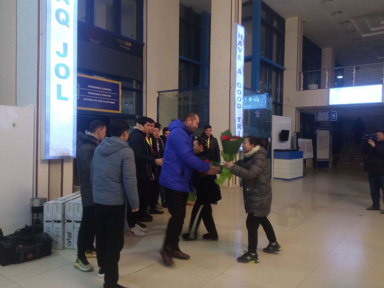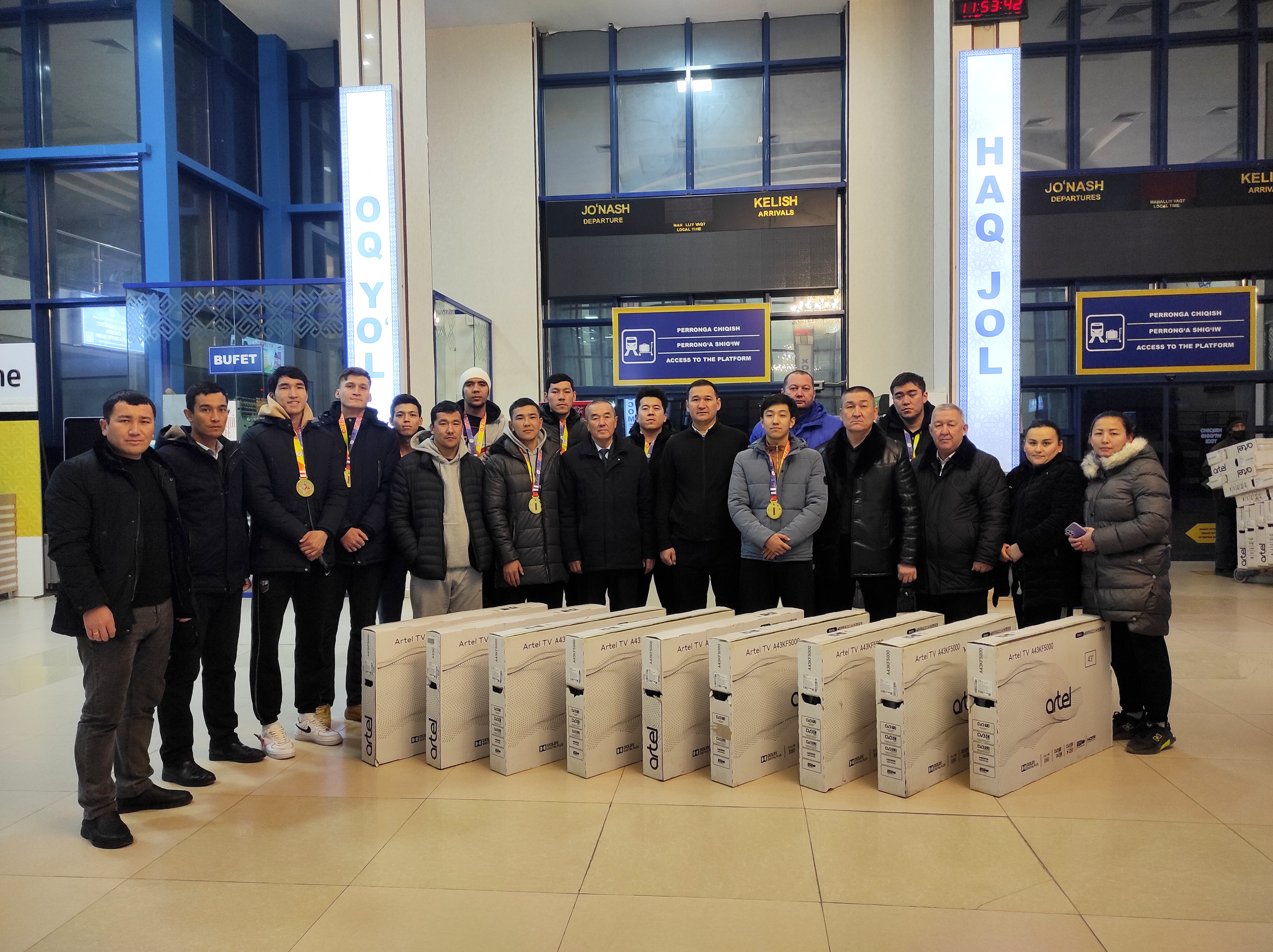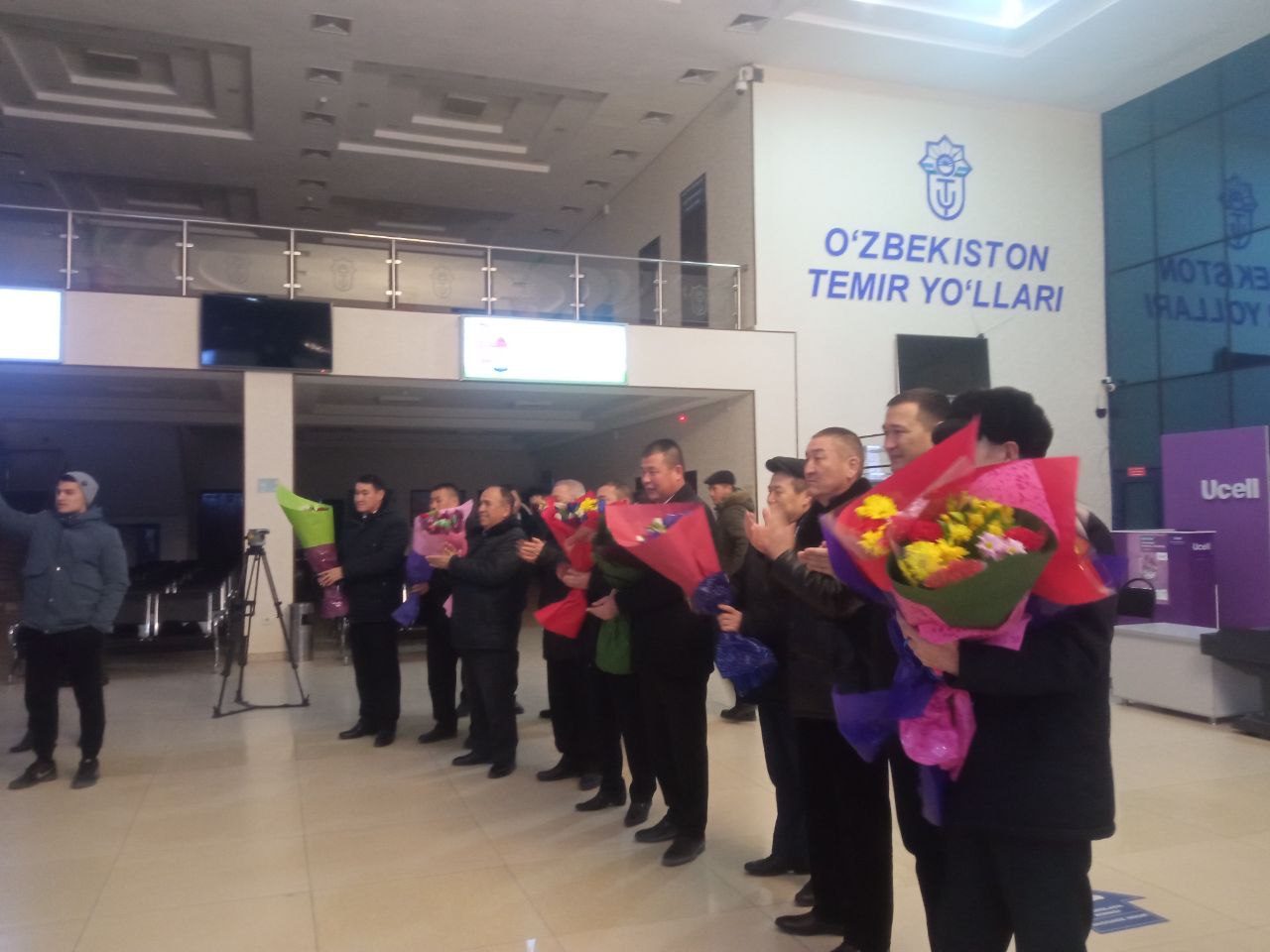 Usı múnásibet penen búgin erte tańnan Nókis temir jol vokzalında QR Sporttı rawajlandırıw ministrliginiń bólim baslıǵı A.Temirbaev, filial direktorınıń Jaslar máseleleri hám ruwxıy-aǵartıwshılıq isleri boyınsha birinshi orınbasarı D.Nurıshov, sport túrleri fakulteti dekanı R.Shaniyazov, dekan orınbasarları, kafedra baslıqlar, professor-oqıtıwshıları «Universiada – 2022» sport oyınlarınıń Basketbol boyınsha chempion Ózbekstan mámleketlik dene tárbiyası hám sport universiteti Nókis filialı er balalar saylandı komandasın múnásip kútip alındı.