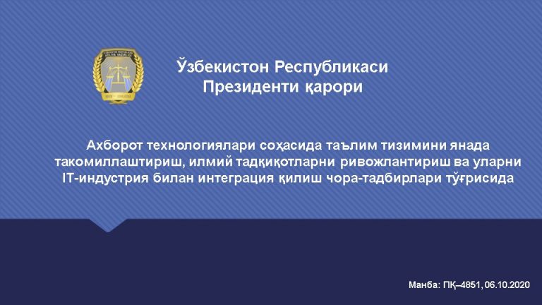 Ахборот технологиялари соҳасида таълим тизимини янада такомиллаштириш, илмий тадқиқотларни ривожлантириш ва уларни IT-индустрия билан интеграция қилиш чора-тадбирлари тўғрисида 21 октябрь 2020
