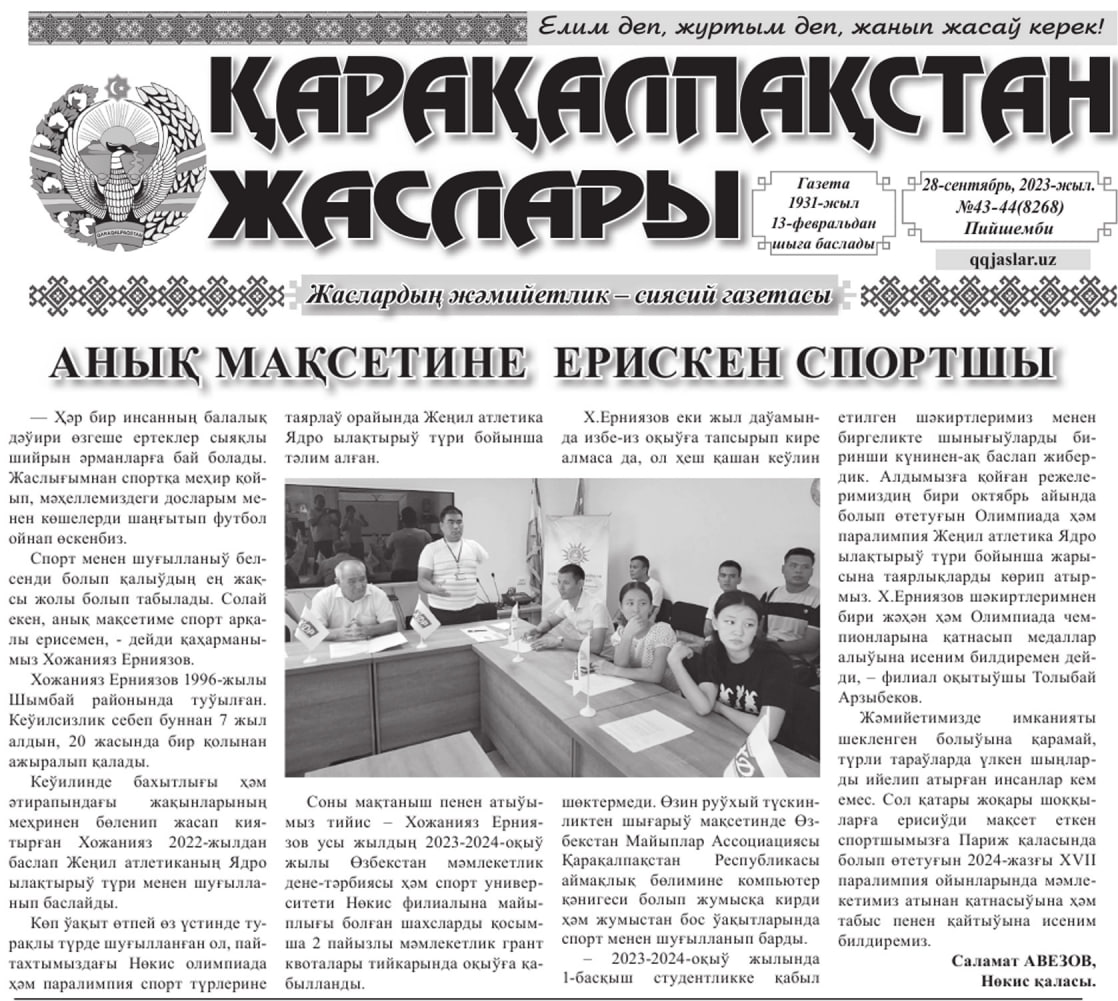 Ózbekstan mámleketlik dene tárbiyası hám sport universiteti Nókis filialı «Sport túrleri» fakulteti «Jeńil atletika» qánigeliginiń 1-kurs studenti Xojaniyaz Erniyazov haqqında maqala «Qaraqalpaqstan jasları» gazetasınıń 2023-jıl 28-sentyabr kúngi 43-44-sanında jarıq qórdi.