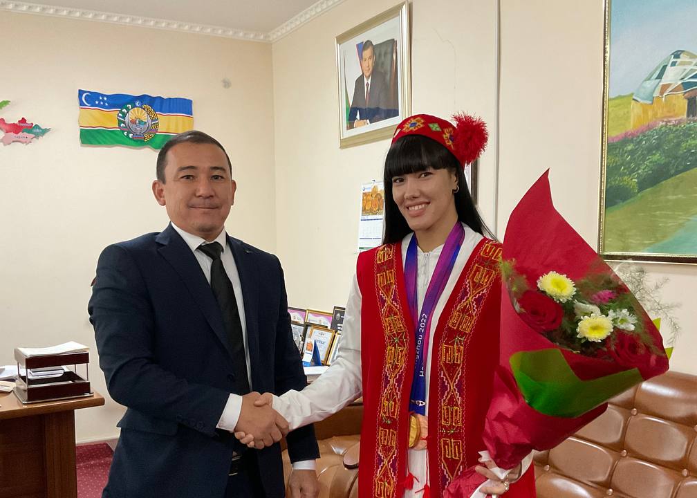 Búgin Ózbekstan mámleketlik dene tárbiyası hám sport universiteti Nókis filialı direktorı, professor B.Erimbetov qılıshpaz studentimiz Zaynab Dayıbekovanı qabılladı hám erisken tabısı menen qutlıqlap, filial jámááti tárepinen tayarlanǵan estelik sawǵaların tapsırdı.