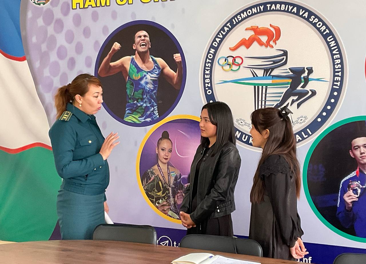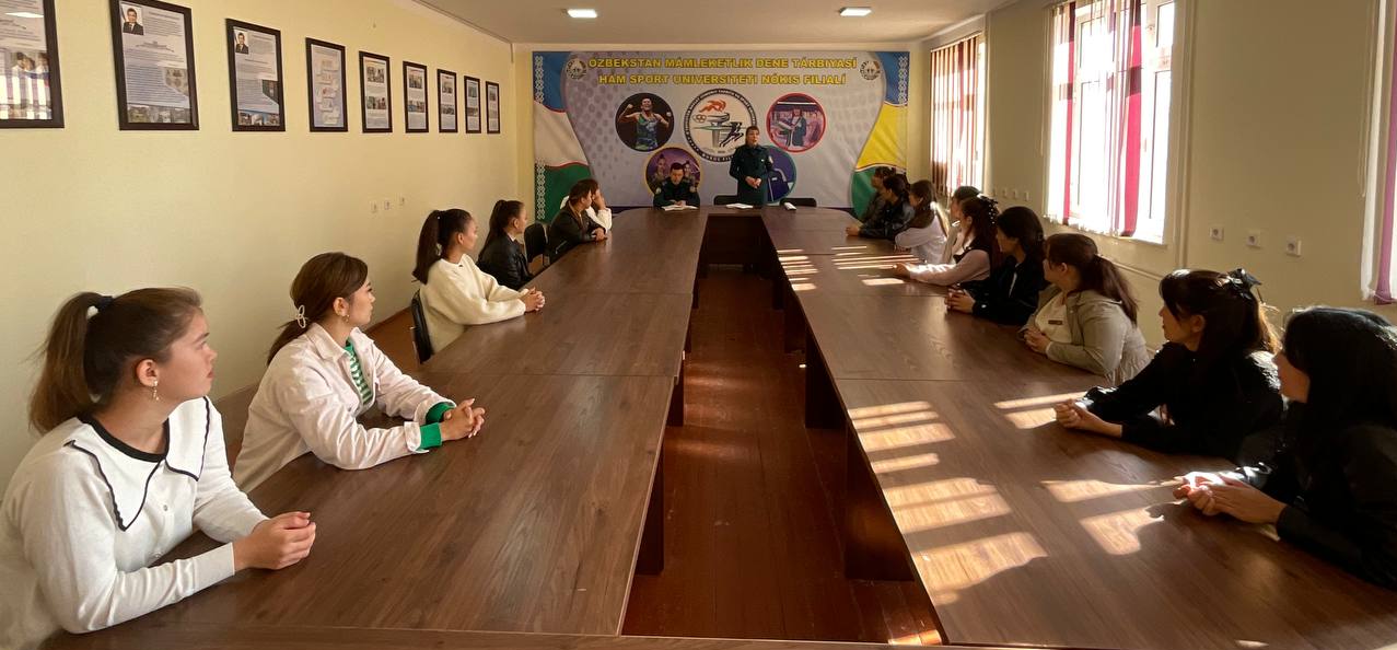 Elimizde hayal-qızlar arasında zorlıq hám jınayatshılıqtıń aldın alıw maqsetinde Nókis qalalıq IIO JMB XKMB aǵa inspektorı podpolkovnik A.Namenova hám filial profilaktika inspektorı R.Ismaylov qatnasında Ózbekstan mámleketlik dene tárbiyası hám sport universiteti Nókis filialı student qızlar menen ushırasıw bolıp ótti.