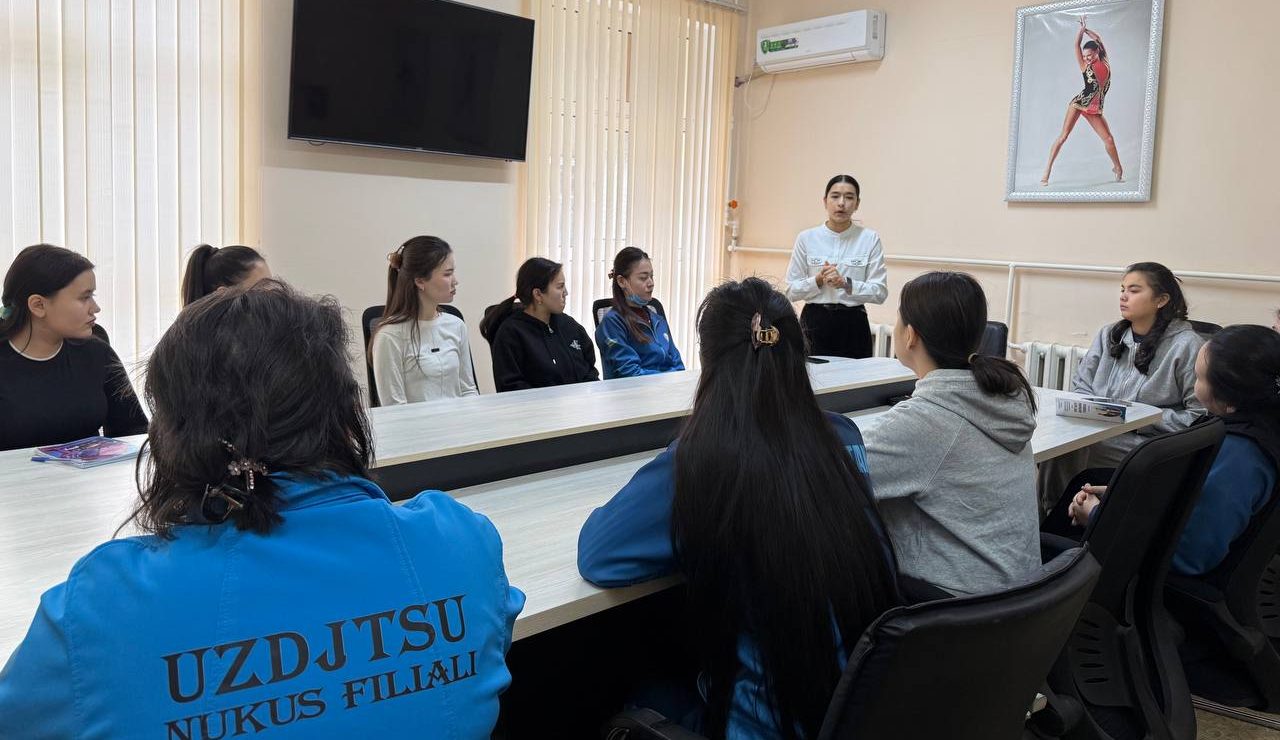 “Koordinaciyalıq hám ciklik sport túrleri teoriyası hám metodikası” kafedrası docenti T.Djumaniyazova hám p.i.b.f.d (PhD), docent D.Astankulova Nókis qalasındaǵı «Gimnastika sport túrlerine qánigelestirilgen sport mektebi» trenerlerine «Kórkem gimnastikashılardıń arnawlı tayarlıǵın hám buyımlar menen orınlanatuǵın quramalı shınıǵıwlar texnikasın jetilistiriw» atamasında seminar ótkerdi.